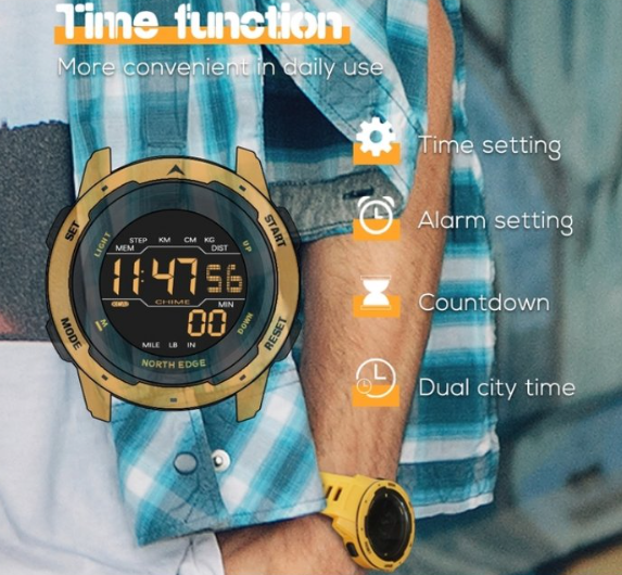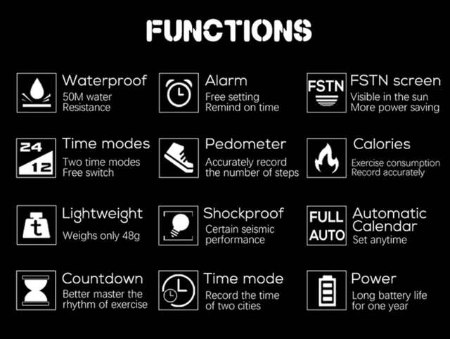 | Тип призначення | Воно-спортивний чоловічий годинник з каучуковим ремінцем з підсвічуванням з лічильником калорій,таймером |