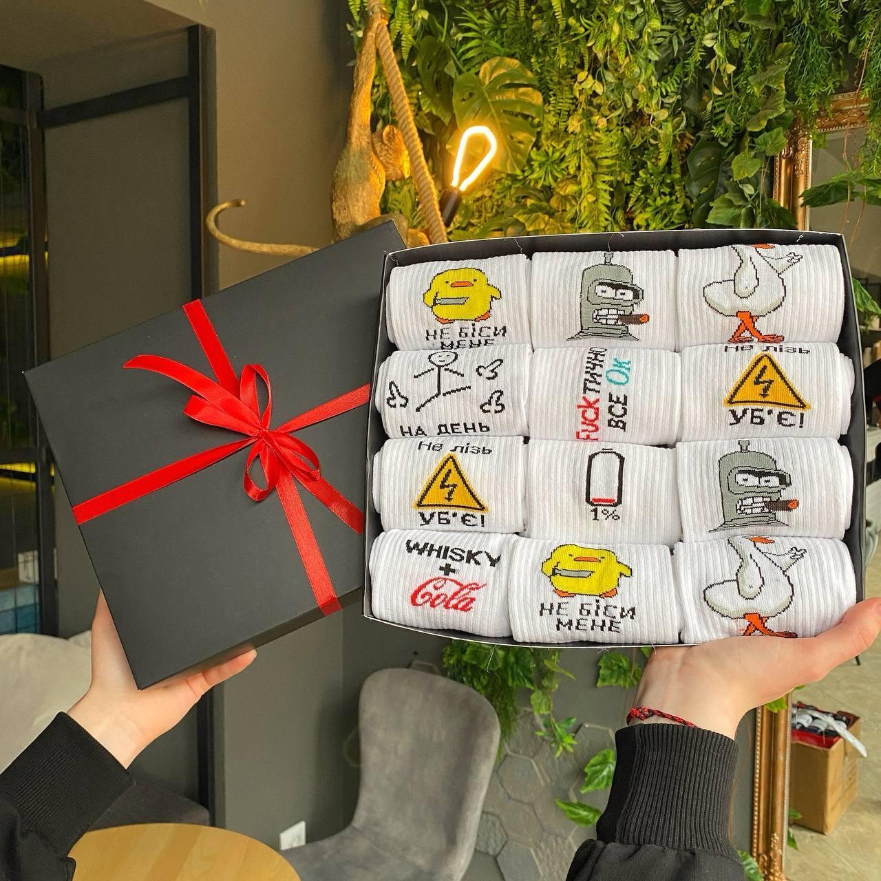Прикольний подарунок парню бокс високих яскравих шкарпеток 12 пар у подарунковій коробці 40-45р