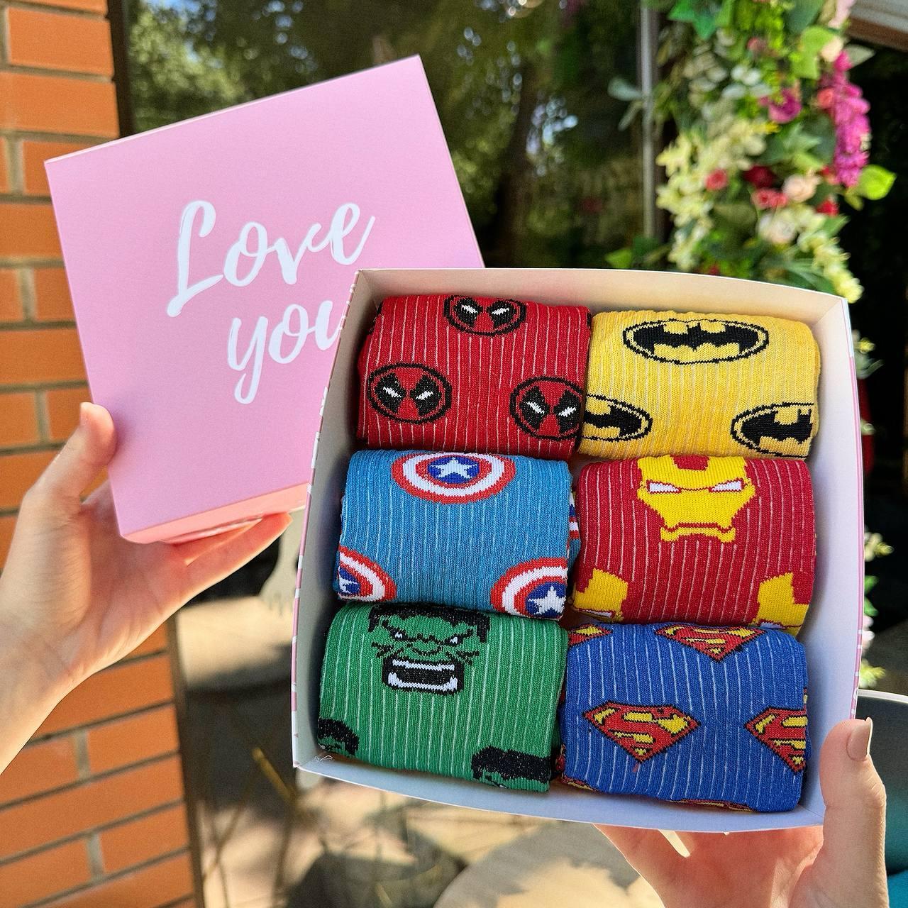 Креативний бокс шкарпеток чоловічих довгих весна-осінь з яскравими героями Марвел 40-45 6 пар у красивій упаковці